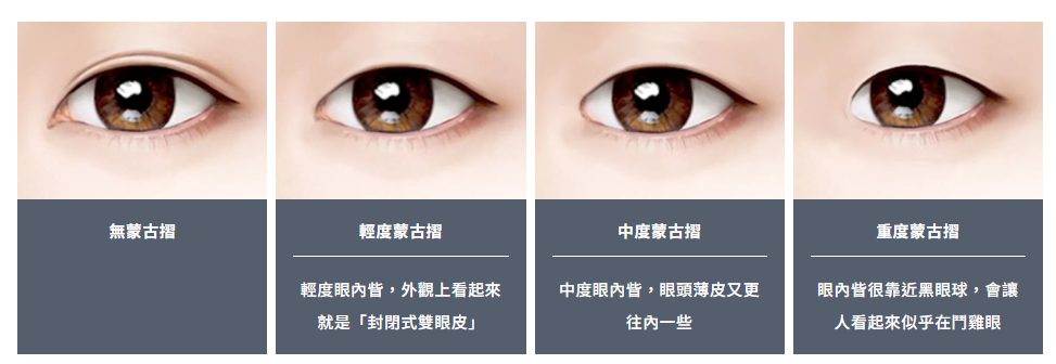 蒙古摺,也就是眼頭多餘的贅皮,而在學理上大概分為以下四種類型: