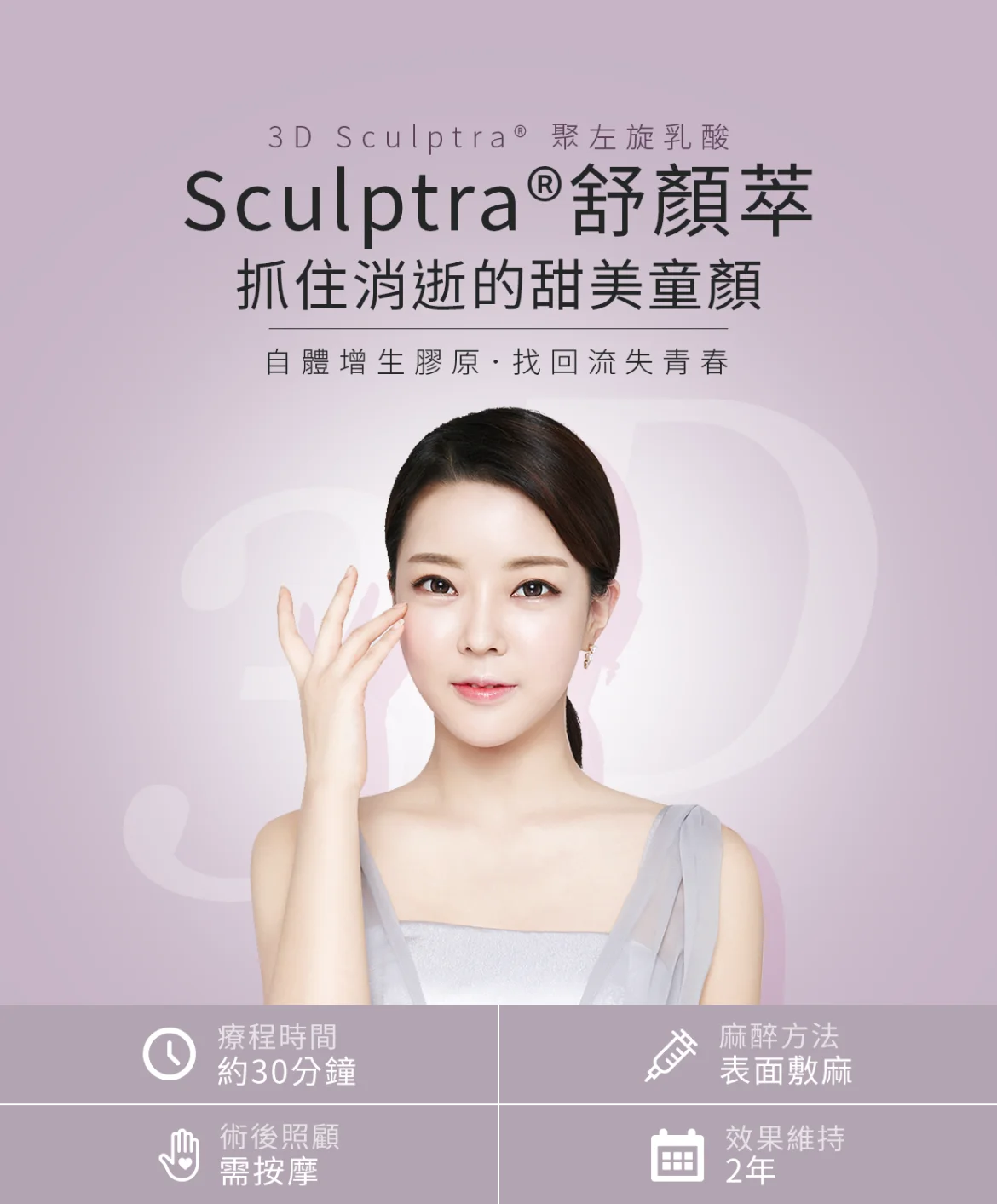 舒顏萃 Sculptra ® 又稱3D聚左旋乳酸,俗稱童顏針。主要成份為聚左旋乳酸, 一種不會引起體內排斥及能被體內自行分解代謝的物質,能改善皮膚的凹陷,特別是鼻唇溝、皮膚皺褶及皺紋,無需於治療前進行皮膚過敏測試,也可安全使用。
